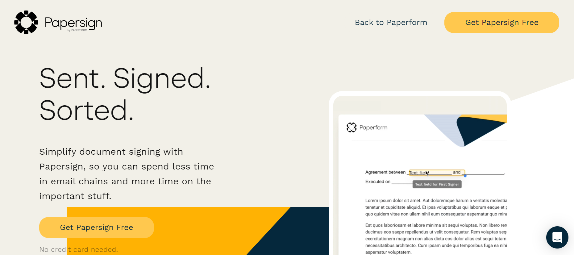 40. PapersignPapersign is an e-signature solution designed to simplify creating, sending, and signing documents, so you can spend more time on the things that matter.One can go from a blank page to a signed document in just a few minutes. Upload PDFs, create documents from scratch, or mix and match the two to create contracts at lightning speed. Unlike other eSignature solutions, Papersign also lets you easily match your brand identity by adding logos, rich imagery, and a range of different fonts, colors, and formatting options. Papersign has robust security measures to protect your documents and signatures. It complies with the requirements of several eSignature legislation in the US, EU, UK, Australia, and New Zealand to ensure the privacy of your information. It also has a seamless built-in integration with Paperform that lets you automatically trigger signature requests for your documents. It's free, so you can play around and send your first signature request entirely risk-free today.
