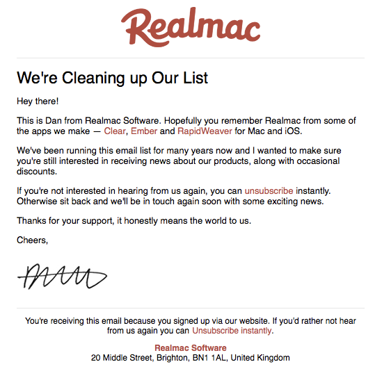 Realmac email pro-actively asking subscribers if they are interested to stay on the email listIt will help your sender reputation as people who would have otherwise marked you as spam are removed. So you get fewer complaints and high delivery rate.