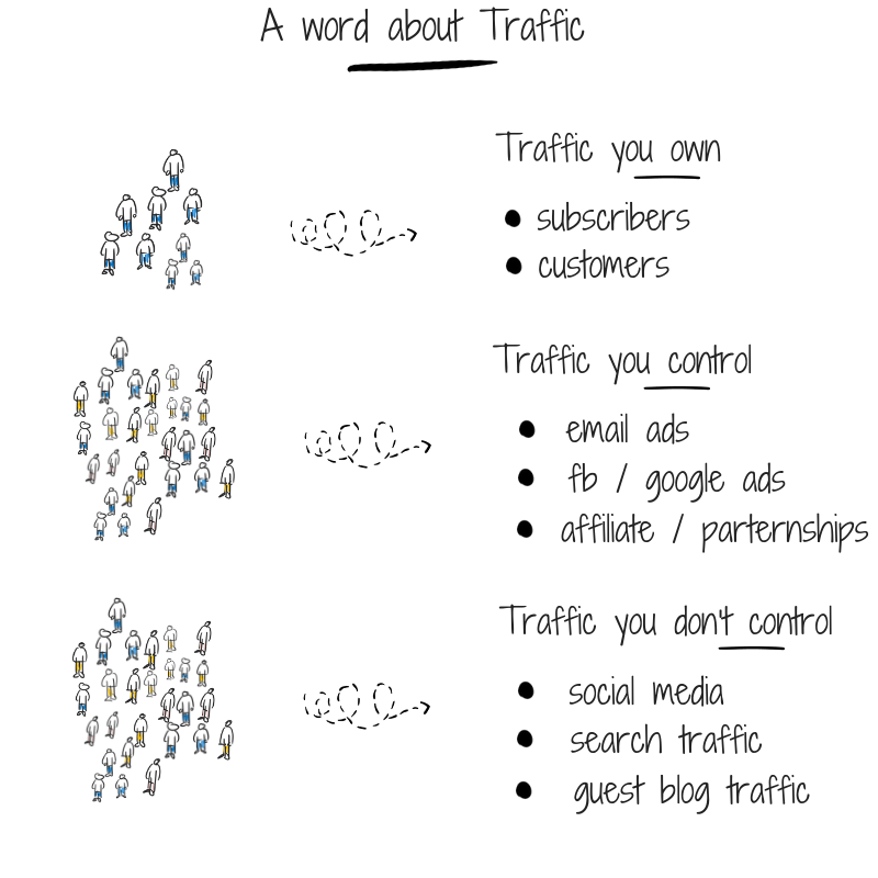 Traffic you control (paid traffic) comes from ads (email, Facebook, Google) and affiliate partnerships. As your input money increases, the resultant traffic also increases.