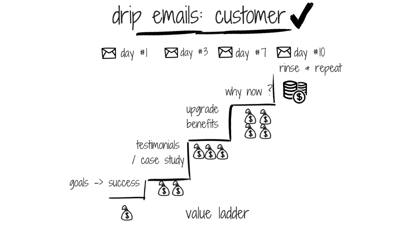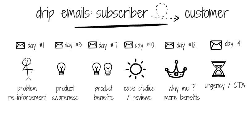 We have provided a blueprint drip sequence which first does problem reinforcement, build product awareness, builds trust via case study or reviews and then nudges leads to becoming a customer with some urgency or FOMO Offer (fear of missing out).