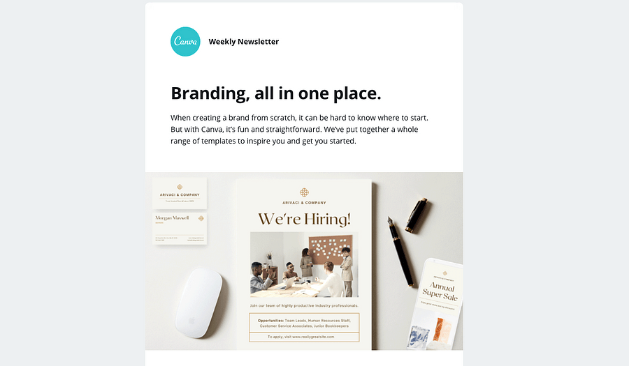 Source: Canva NewsletterPeople don’t always get to see what you post during the moment of its release so putting together a weekly recap is a great way to combine all of your best posts in one place. You can lead with subject lines like “In case you missed it…” or “If you haven’t seen our latest post…” This type of content will cause people to become intrigued with what you posted because nobody wants to feel the fear of missing out or FOMO on something new and potentially cool.