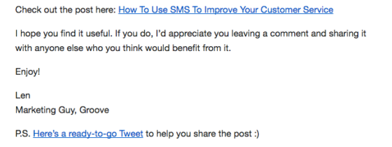 Why not end your email with a link to your best-performing social content subscribers might want to see and share? See how Groove does this. The brand signs off by giving a link to one of its popular Tweets for easy sharing: