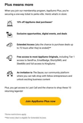 The “now” used in the ending CTA creates a sense of urgency that prompts subscribers to click on it. The terms used, “Join Appsumo Plus now,” are easy to understand as well.