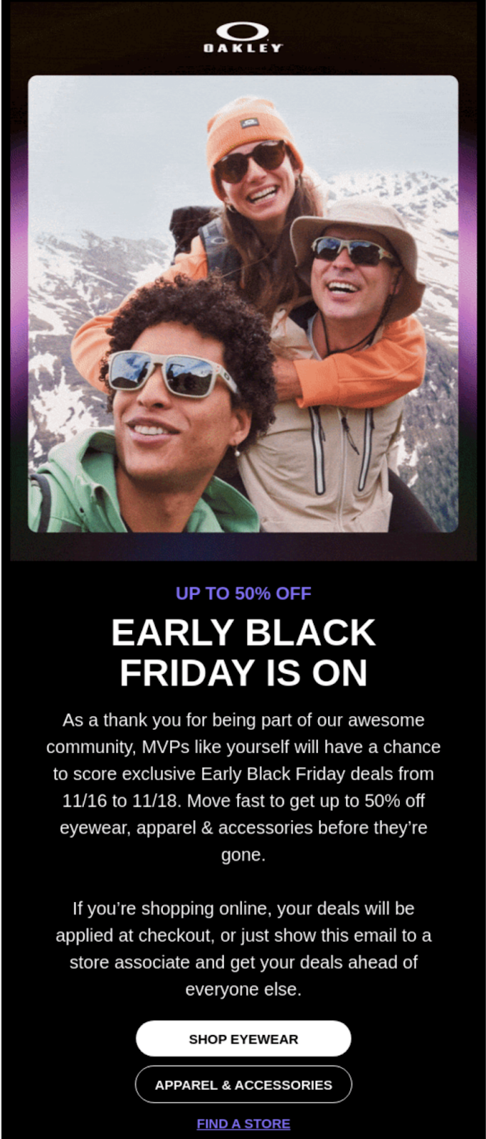 See how Oakley generates that air of exclusivity with the closing limited-time offer phrase “Get your deals ahead of everyone else.”