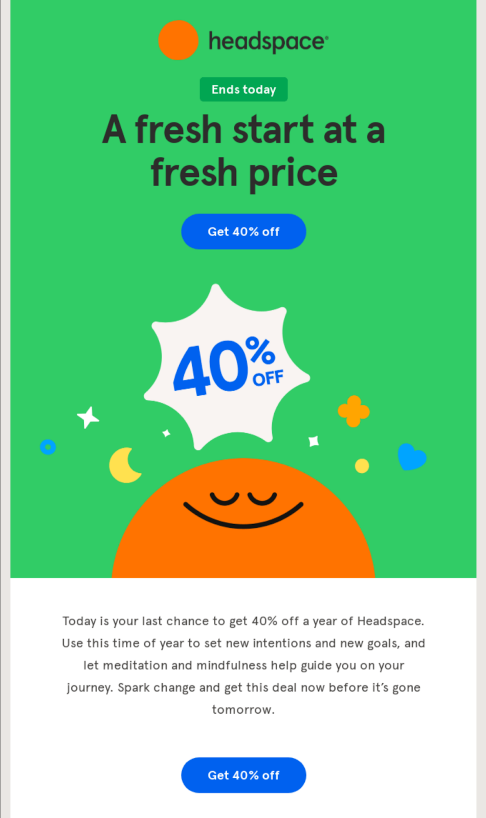 Headspace sure knows how to craft good ones. The brand closes out its email below, for instance, with a CTA that offers clear value. When people click on the button, they’ll know they can “get 40% off.” The CTA is also simple and straightforward: