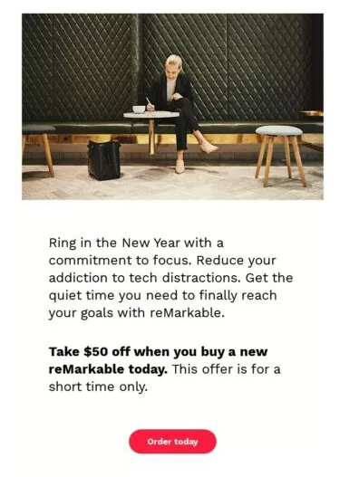Showcase the benefit: Directly connect the limited-time offer to its benefit in the sign-off. The brand reMarkable does this explicitly. In the sentence, “Take $50 off when you buy a new reMarkable today,” the “Take $50 off” highlights the offer's value, encouraging immediate action.