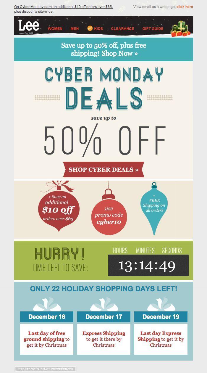 When creating these statements, you want to highlight the fact that your deals are valid for only a limited time. In the email example below, for instance, the brand uses the closing phrase “Only 22 holiday shopping days left!” to emphasize the limited-time nature of the offer. The email also highlights the cut-off times for subscribers to benefit from “free ground shipping” and “express shipping” that will allow them to get their purchased product by Christmas.