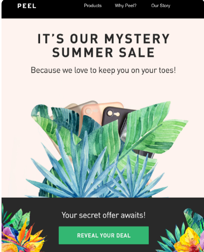 You can also build interest in your offers with your closing statement, enough for subscribers to take your desired action, not later as in the example above, but now. This is what Peel does in the email above. The closing sentence “Your secret offer awaits!” is more than enough for subscribers to click on that “Reveal Your Deal” CTA.
